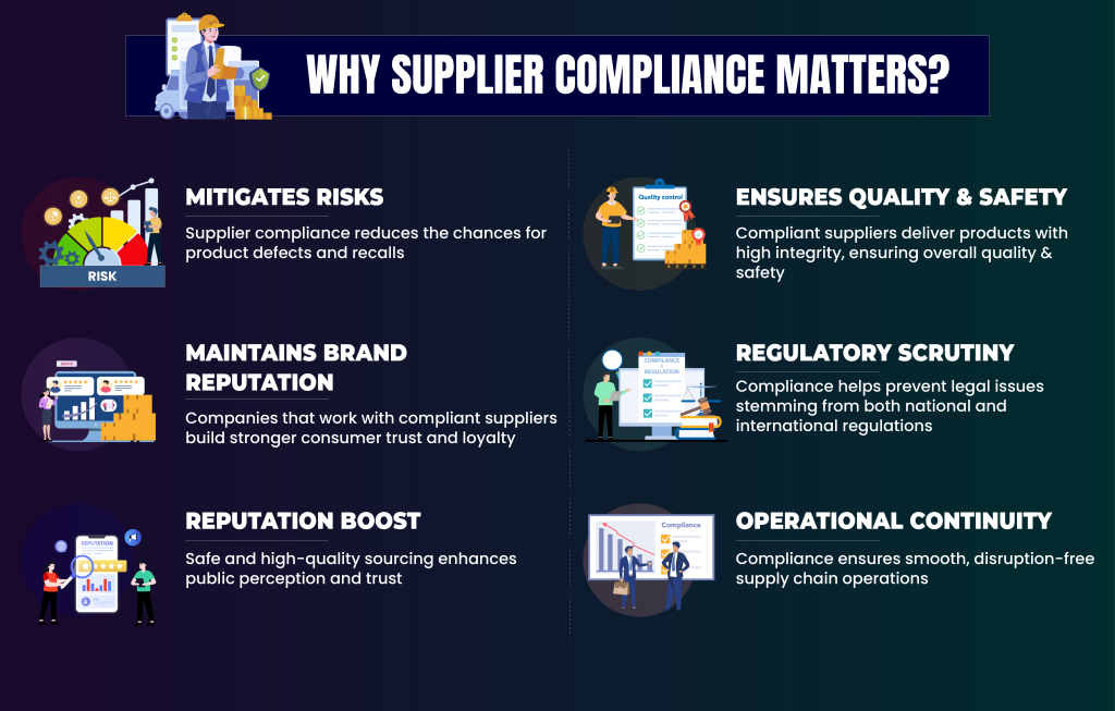 - Operational Continuity: Ensuring supplier compliance helps maintain a stable and efficient supply chain, reducing disruptions and delays, which supports uninterrupted operations and business growth.